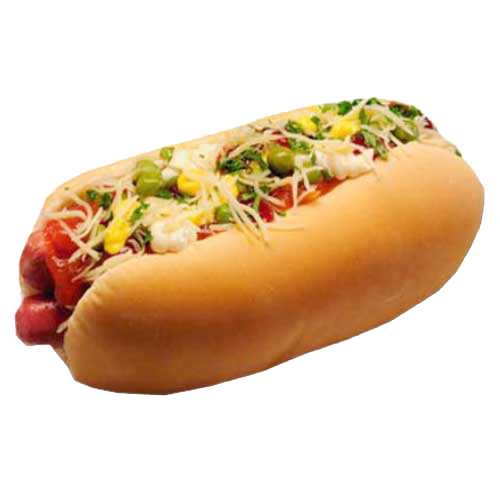 Molho, 2 salsichas, milho, ervilha, ketchup, mostarda, maionese, batata palha, queijo parmesão, catupiry e cheddar.