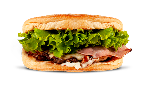 Filé mignon na chapa, maionese, ketchup, mostarda, milho, ervilha, ovo, queijo, tomate, alface.